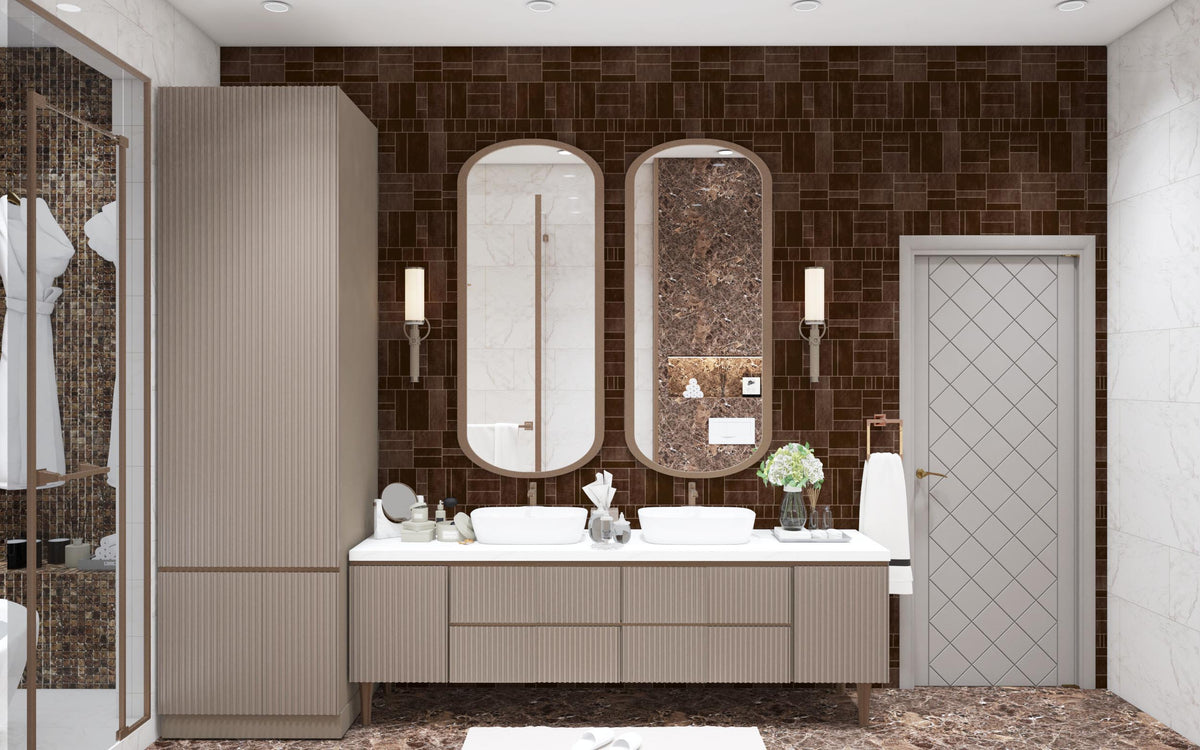 In the en-suite bathroom, marble finishes and deep brown tones create a sense of depth and serenity. Dual basins, ambient lighting, and sculptural mirrors transform the space into a private wellness retreat.