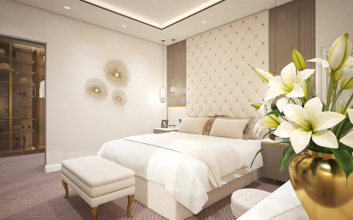 The bedroom sets the tone with its soft neutral palette and tactile layers. A full-height tufted headboard, paired with fluted wood detailing and golden accents, creates an atmosphere of understated elegance. Bespoke lighting and delicate decor touches add warmth and intimacy, while large windows open the space to garden views and natural light.