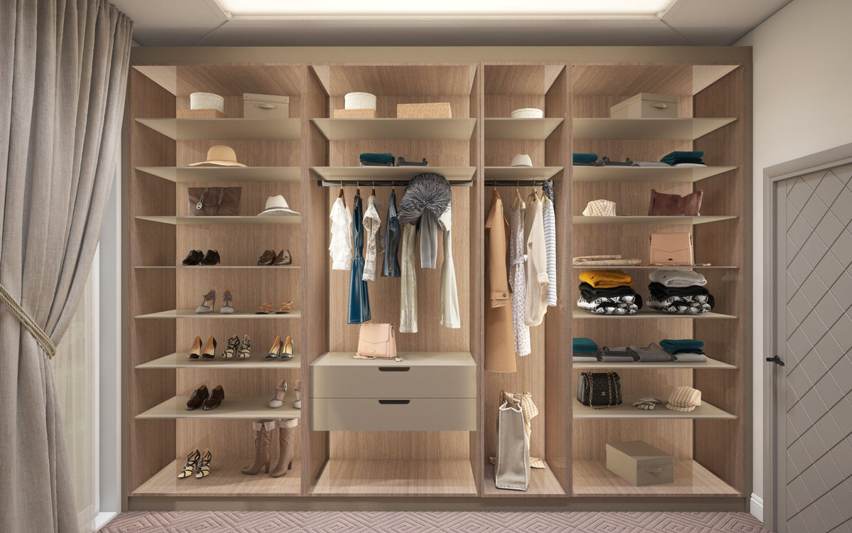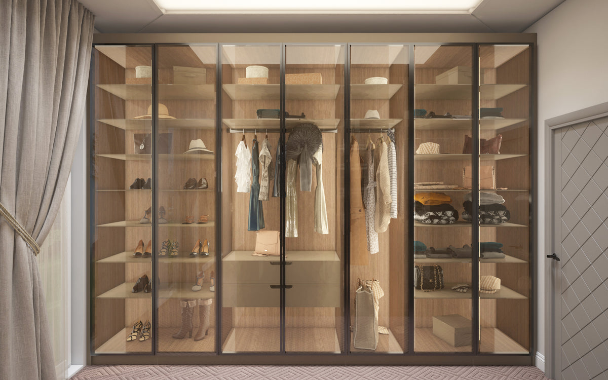 A custom vanity complements the room’s flow, offering both style and utility in perfect harmony. The adjoining walk-in closet features glass-front cabinetry and tailored shelving — combining hotel-grade luxury with home-like comfort.