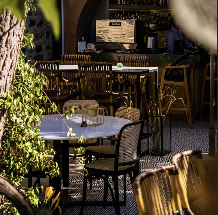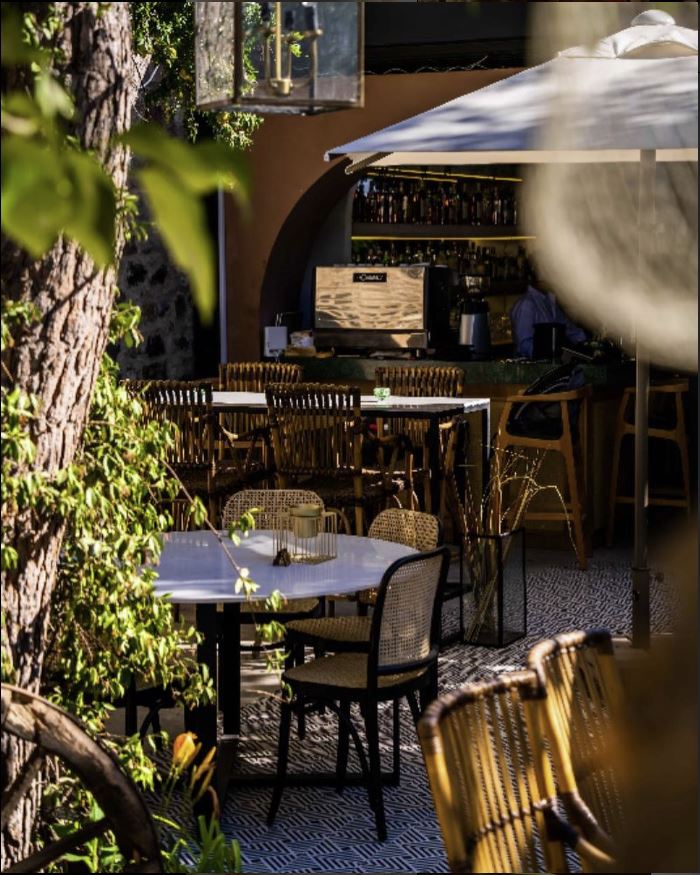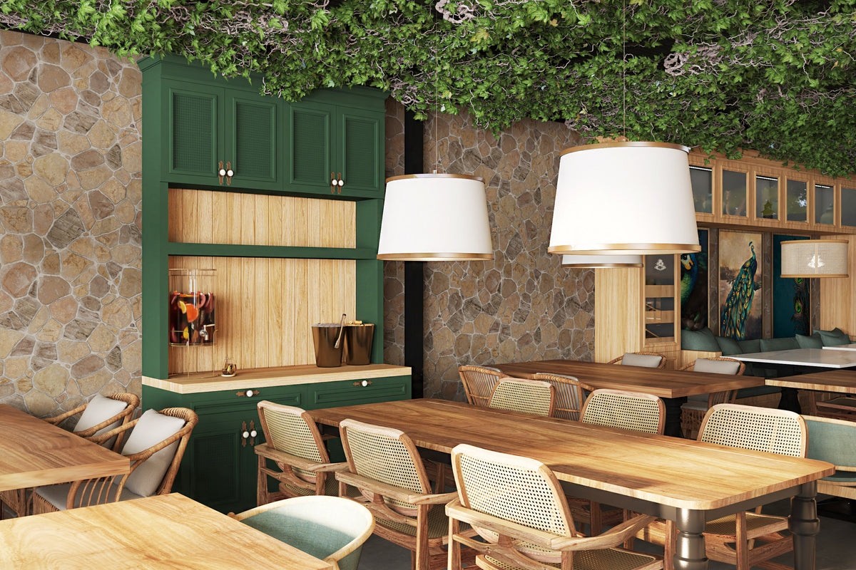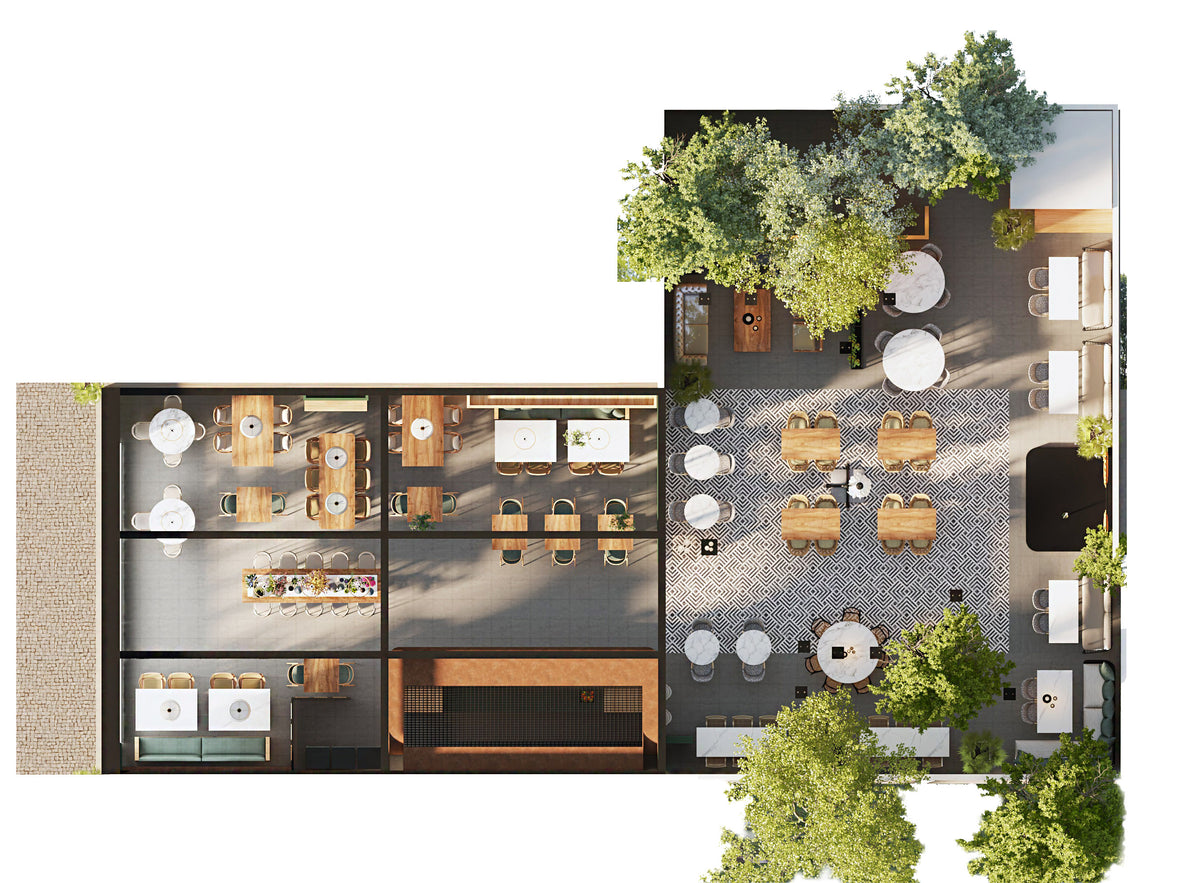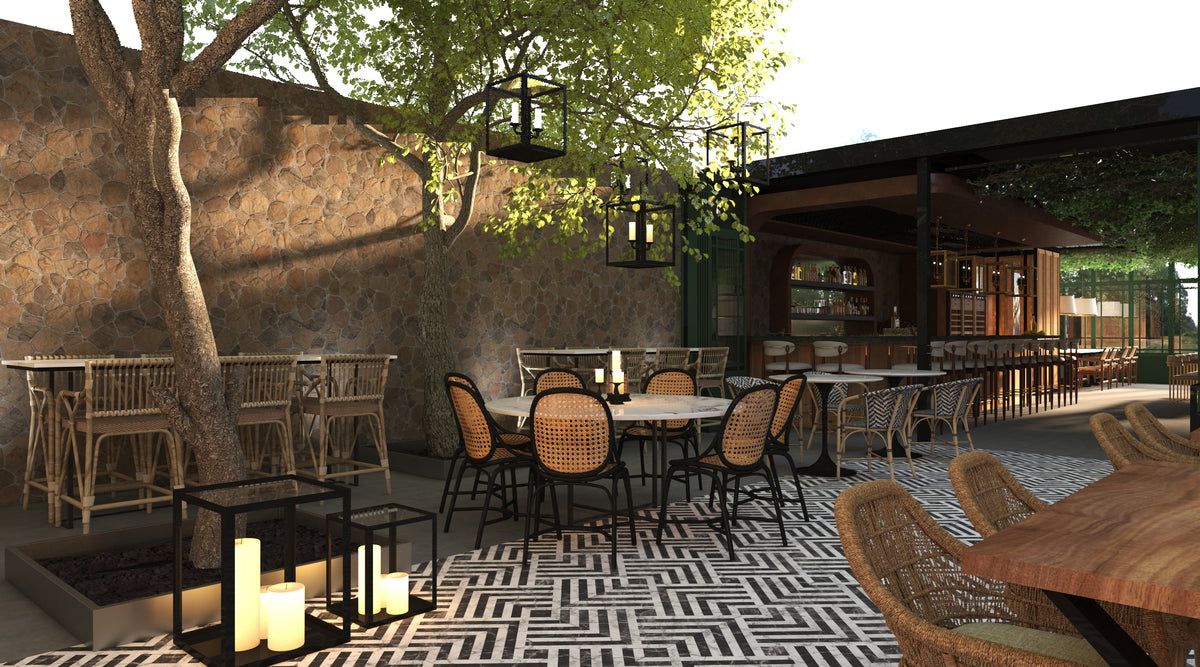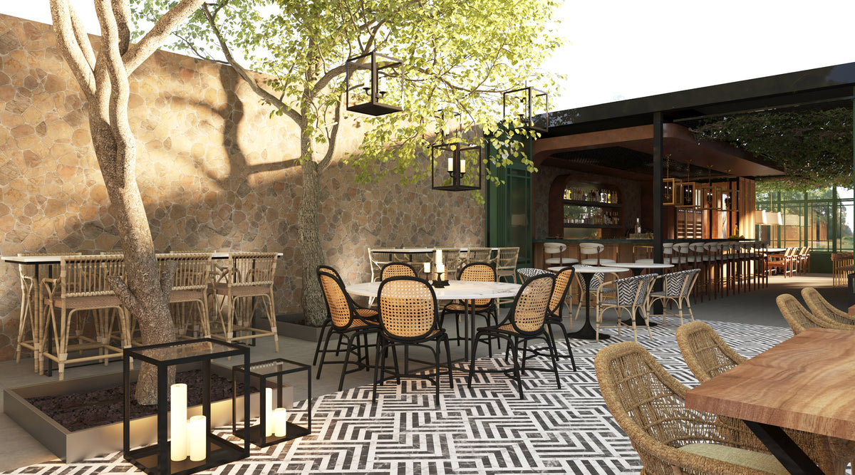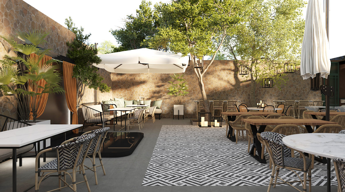 The space blends stone, wood, and metal to create a balance of warmth and sophistication. Deep green façades contrast with terracotta walls, while woven textures and patterned floors introduce movement and rhythm. The open layout connects the indoor dining area with the landscaped courtyard, establishing a seamless flow between architecture and nature.