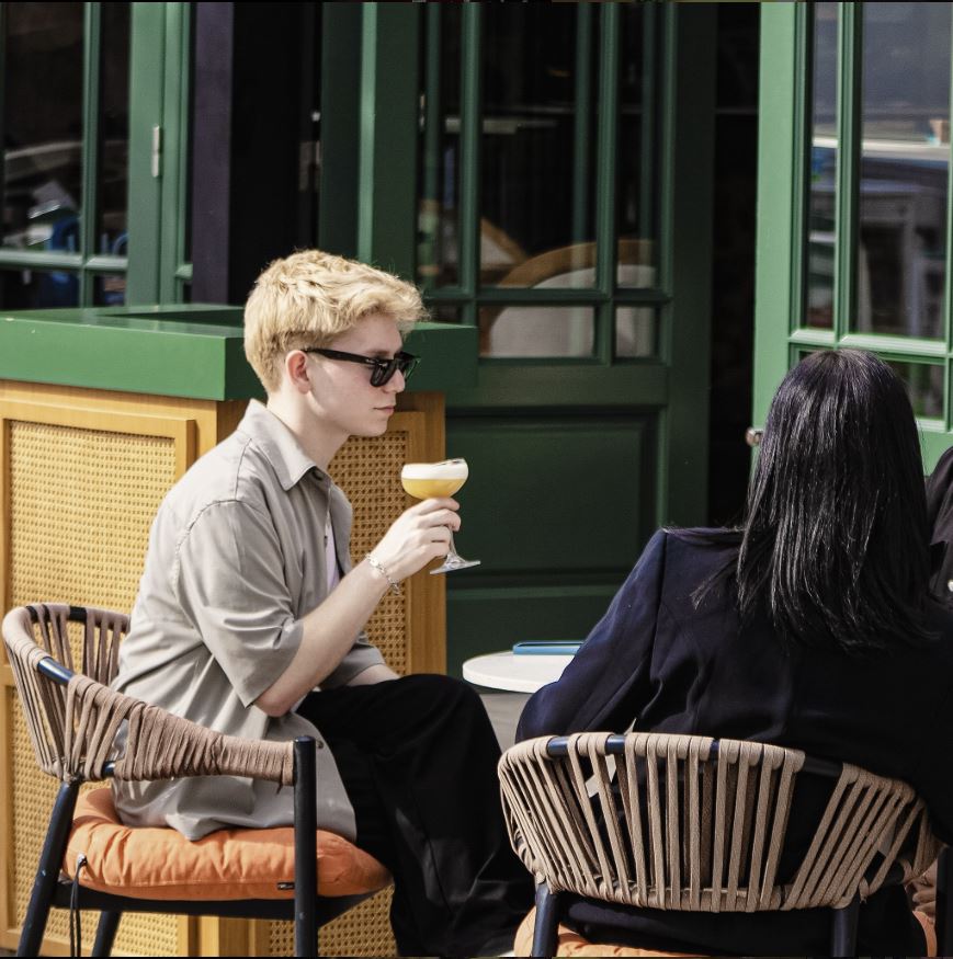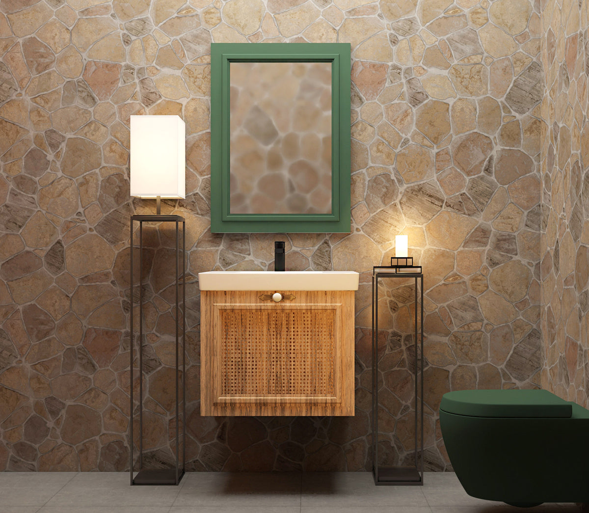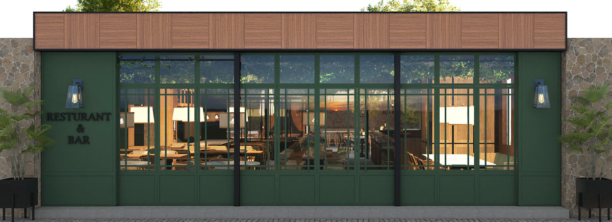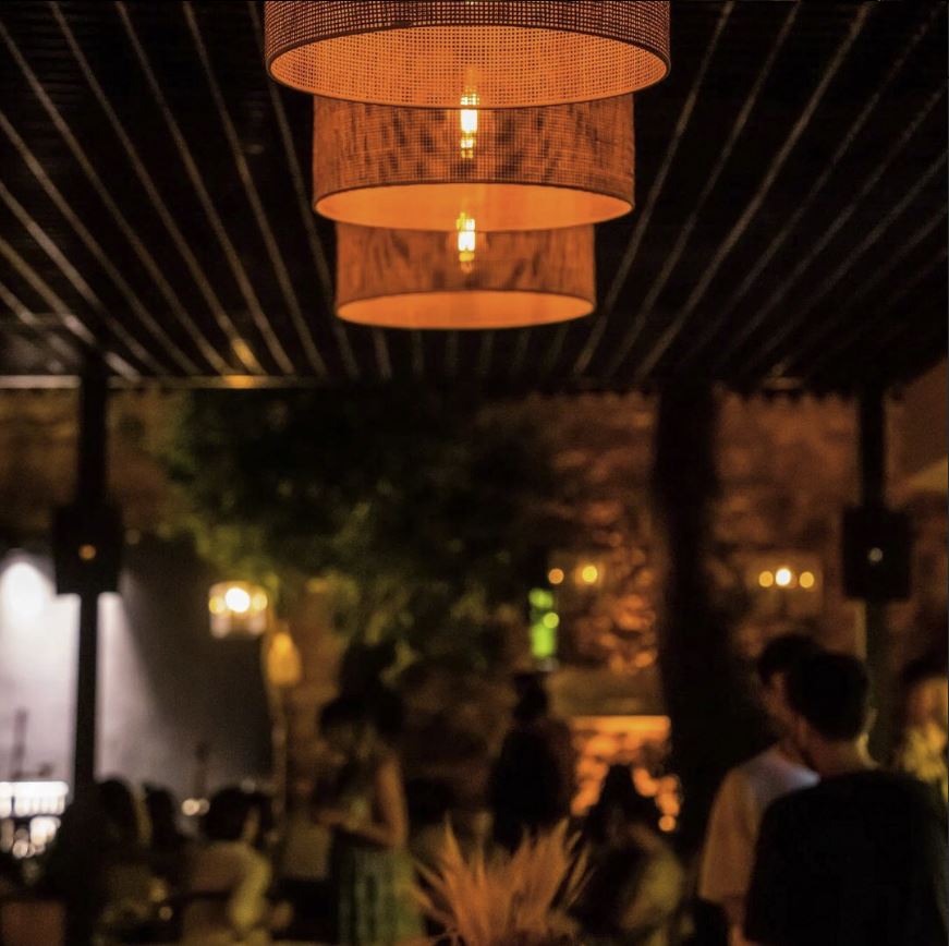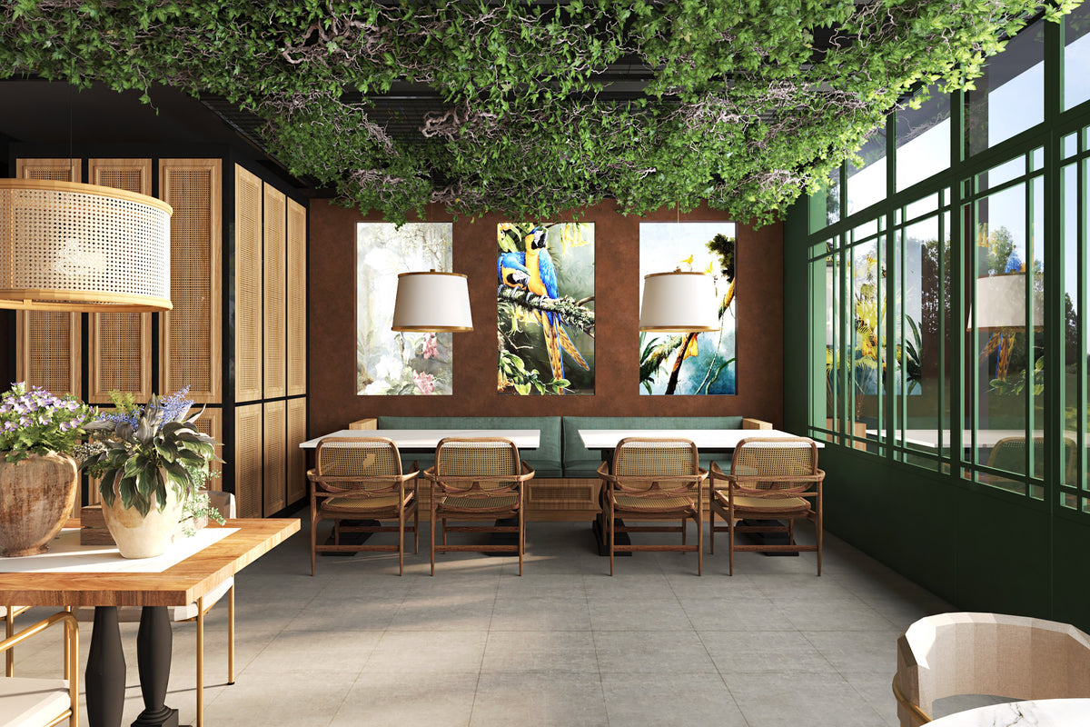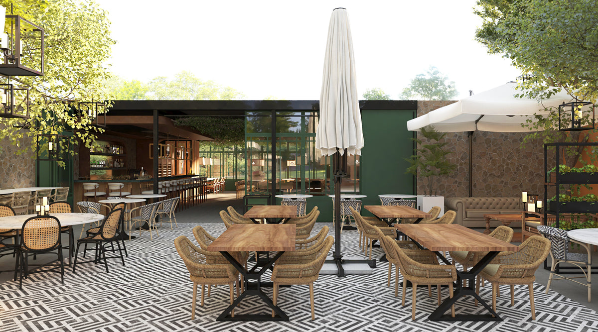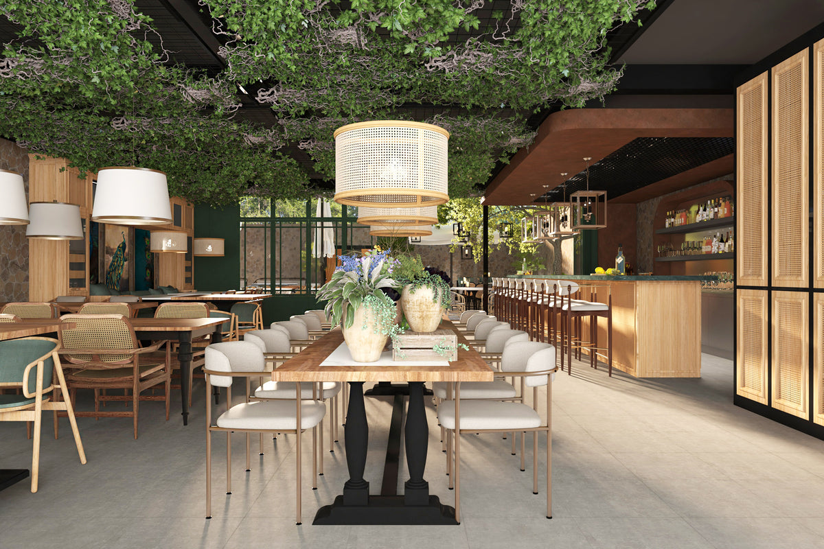 The space blends stone, wood, and metal to create a balance of warmth and sophistication. Deep green façades contrast with terracotta walls, while woven textures and patterned floors introduce movement and rhythm. The open layout connects the indoor dining area with the landscaped courtyard, establishing a seamless flow between architecture and nature.