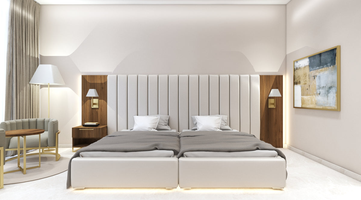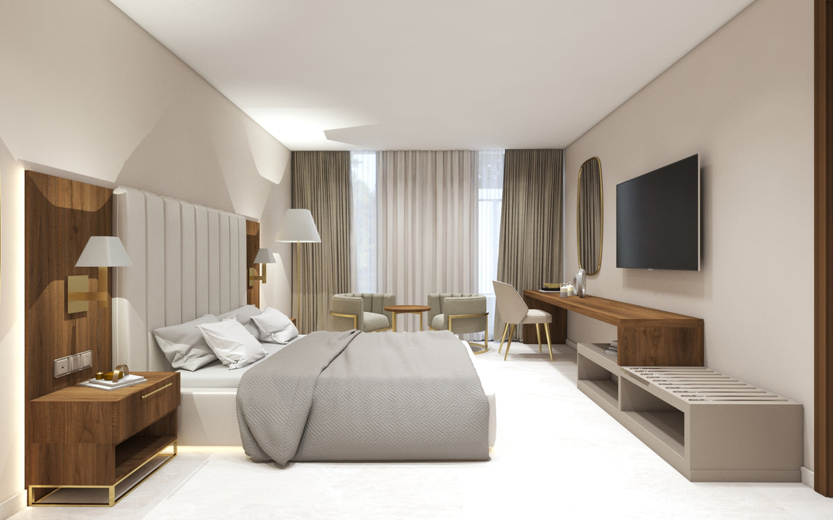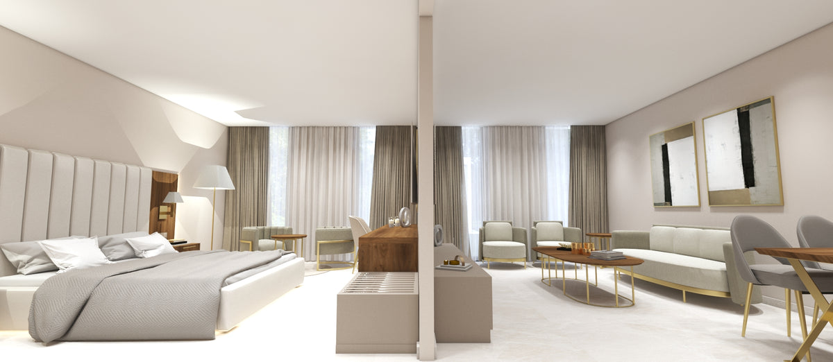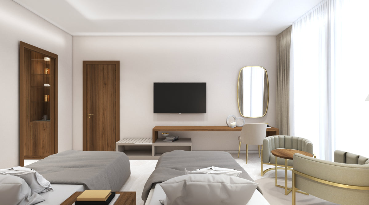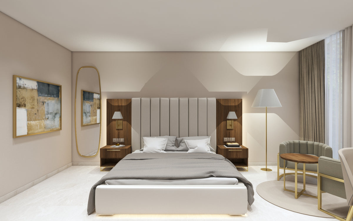 The interiors embrace a neutral palette enriched by natural wood tones, soft textiles, and brushed gold accents. Each suite is thoughtfully composed to balance functionality with indulgence — creating a sanctuary that feels intimate yet grand.