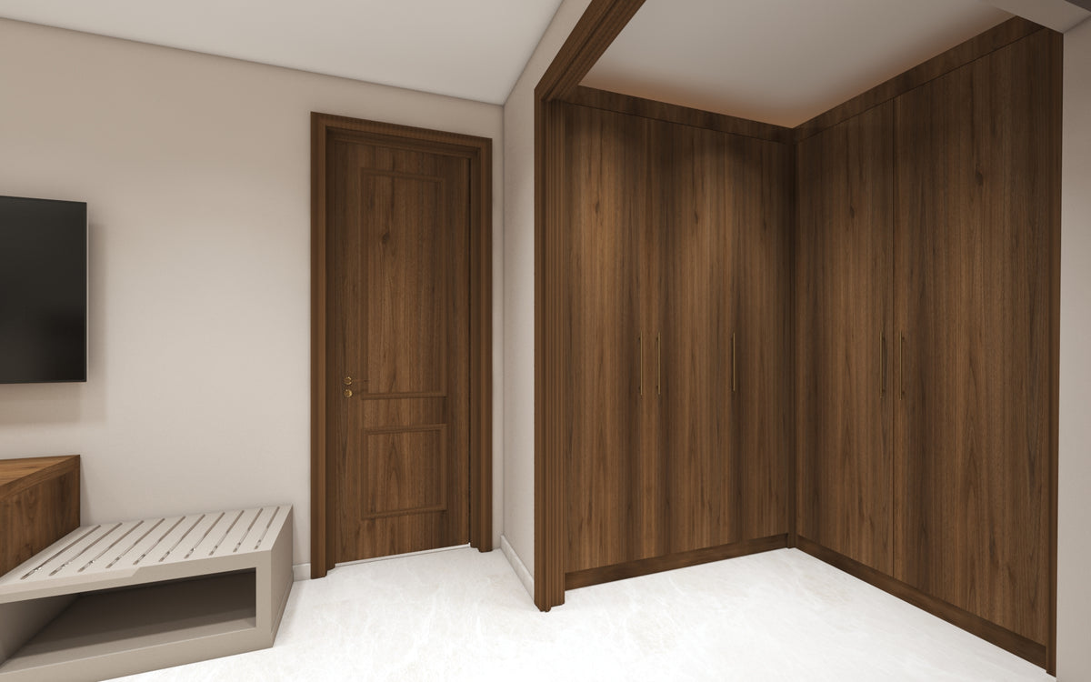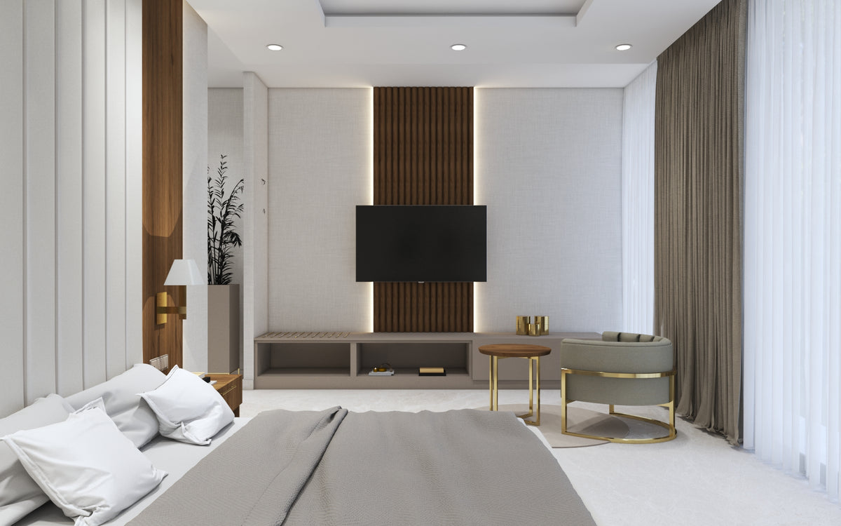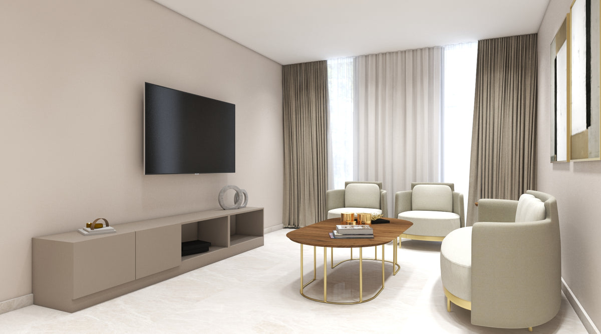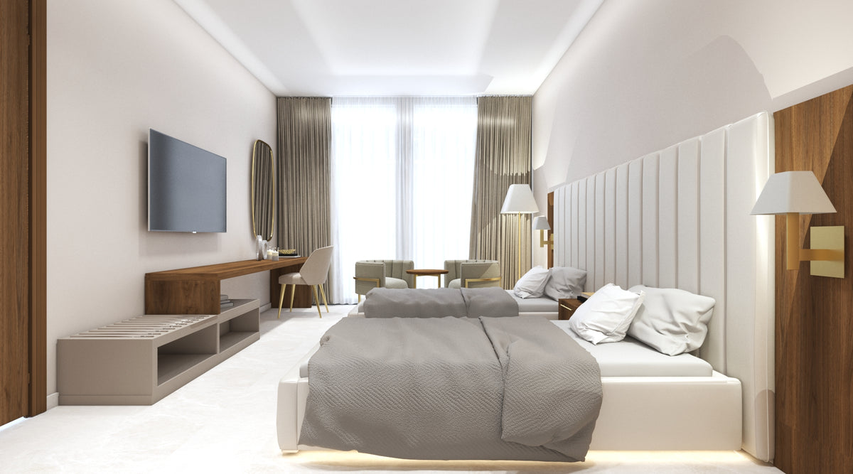 The interiors embrace a neutral palette enriched by natural wood tones, soft textiles, and brushed gold accents. Each suite is thoughtfully composed to balance functionality with indulgence — creating a sanctuary that feels intimate yet grand.