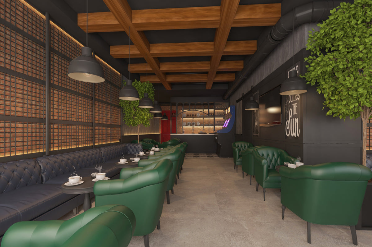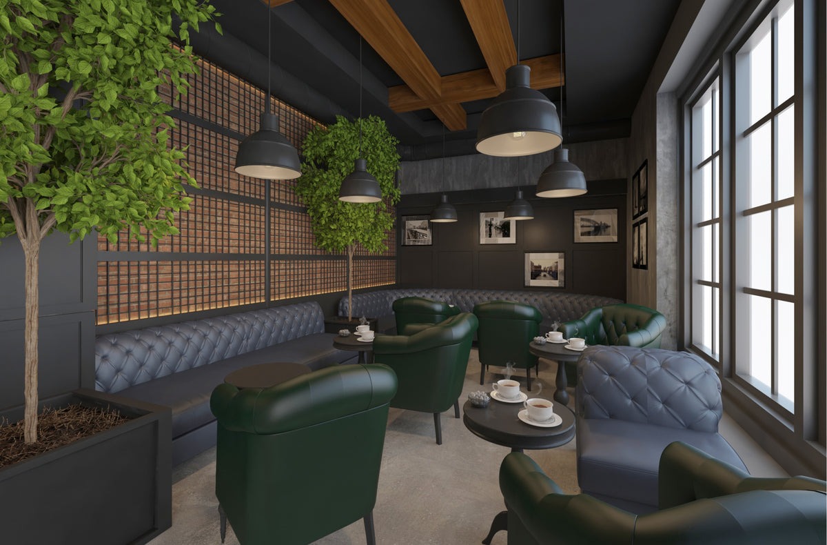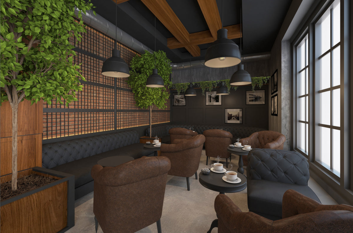 The space features a carefully layered material palette of brick, steel, and natural wood, contrasted by deep leather seating and soft lighting. Exposed beams, custom shelving, and integrated greenery bring warmth and rhythm to the interior, creating an atmosphere that feels both grounded and contemporary.