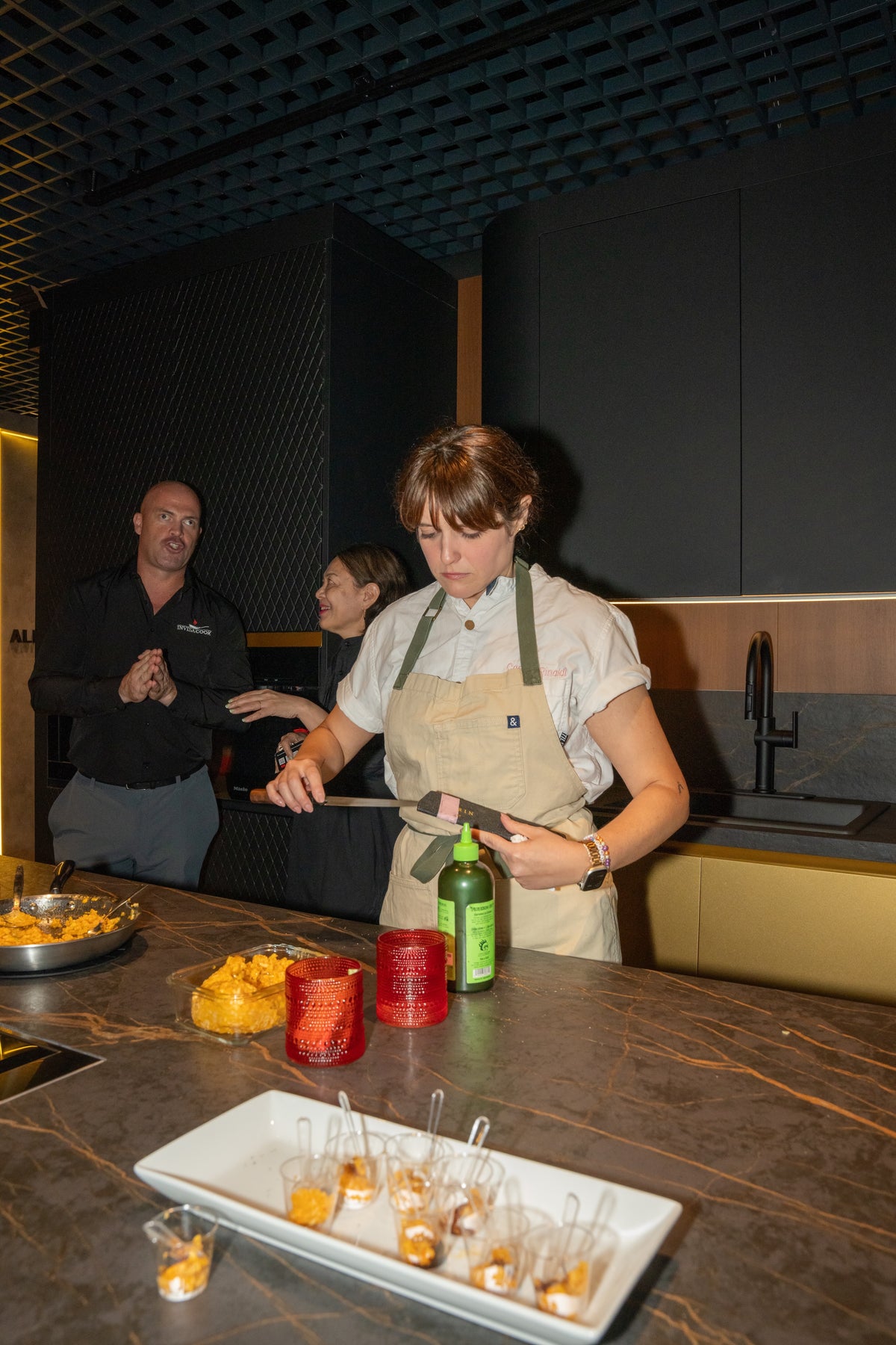 From the moment guests stepped inside, the energy was unmistakable. The sleek Cuzine showroom—refined yet inviting—became a stage where culinary creativity unfolded in real time. The invisible technology of Invisacook worked seamlessly beneath the smooth Dekton surfaces, blurring the line between art and engineering. Flames danced, aromas filled the air, and every movement behind the counter seemed to tell a story of harmony between function and form.