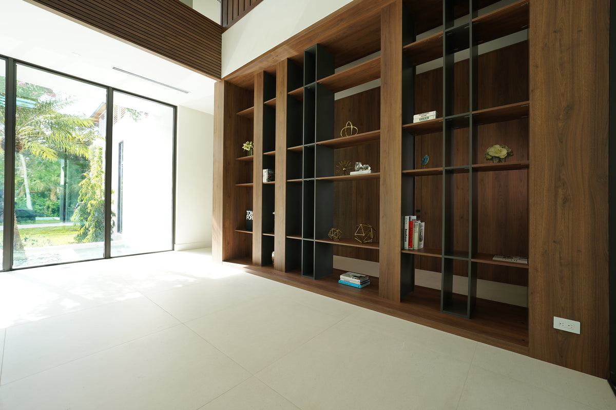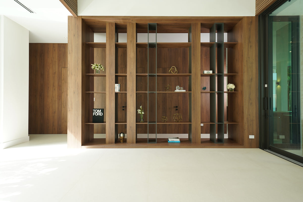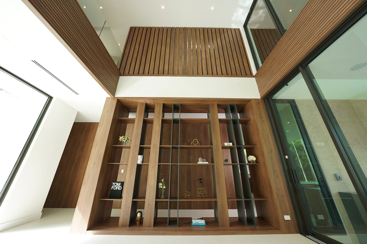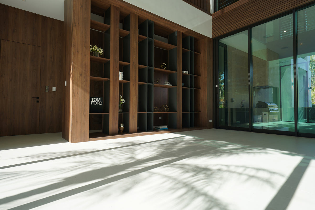 Natural light floods through the floor-to-ceiling glass openings, illuminating the rich wood finishes that anchor the design. Throughout the villa, warm wood tones contrast beautifully with clean architectural lines and neutral surfaces, creating a perfect dialogue between warmth and minimalism. Each custom-built piece, from the shelving systems to the wall panels, reflects the precision and artistry that define Cuzine’s work.