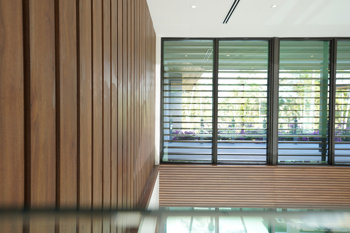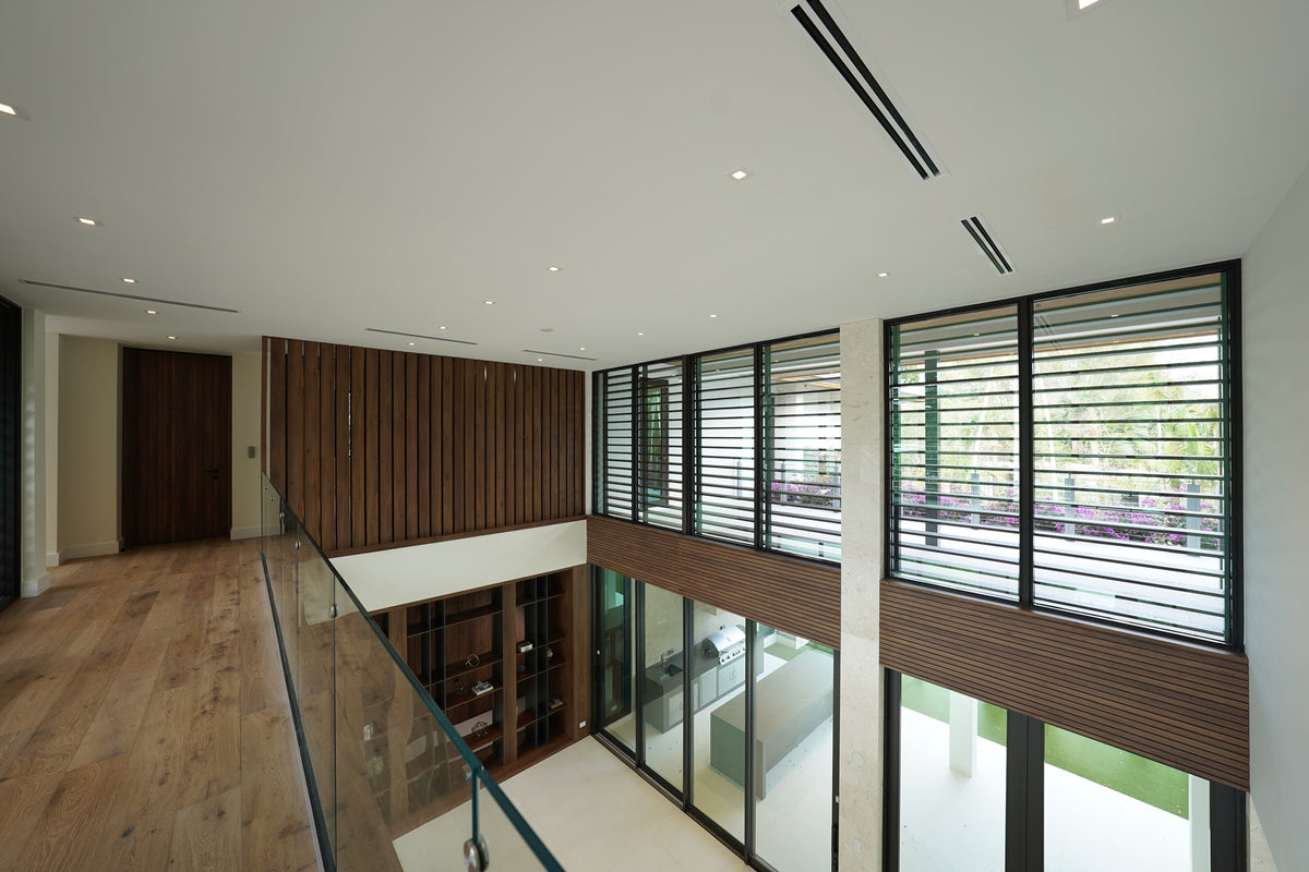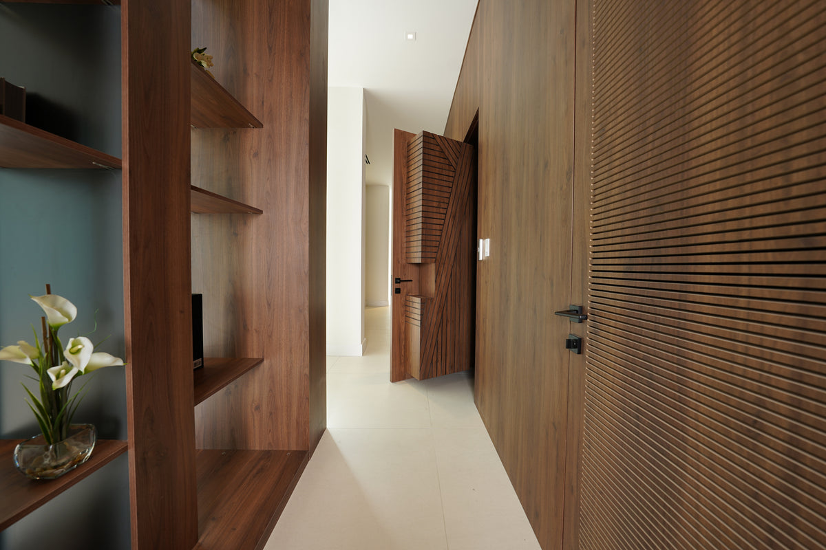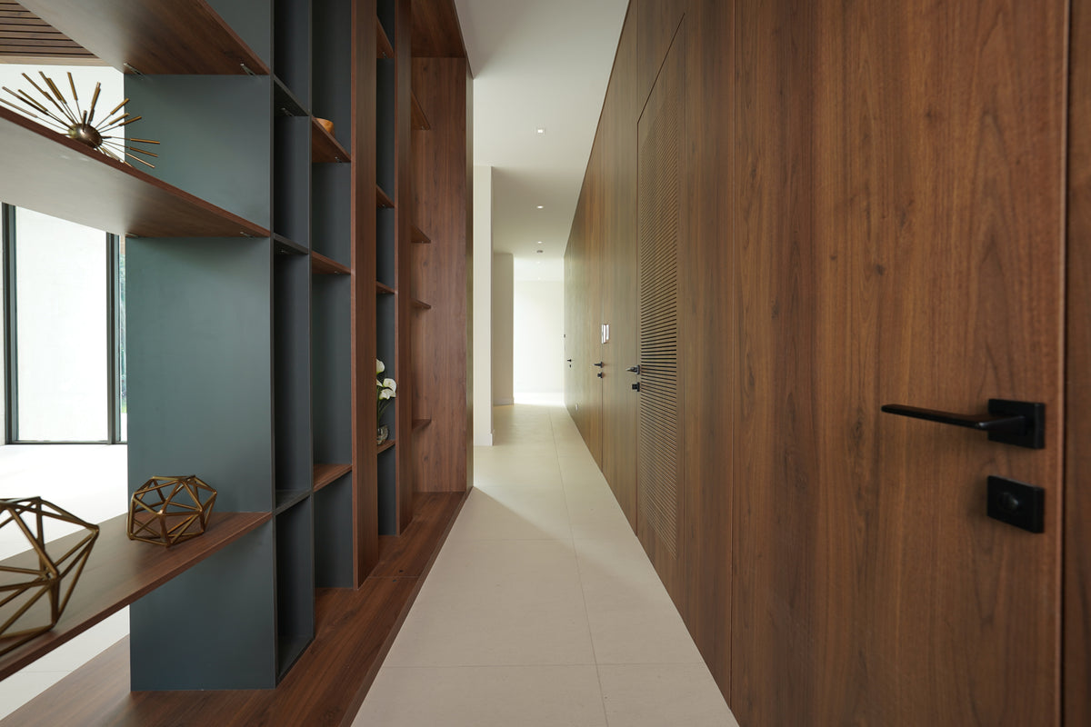 Natural light floods through the floor-to-ceiling glass openings, illuminating the rich wood finishes that anchor the design. Throughout the villa, warm wood tones contrast beautifully with clean architectural lines and neutral surfaces, creating a perfect dialogue between warmth and minimalism. Each custom-built piece, from the shelving systems to the wall panels, reflects the precision and artistry that define Cuzine’s work.